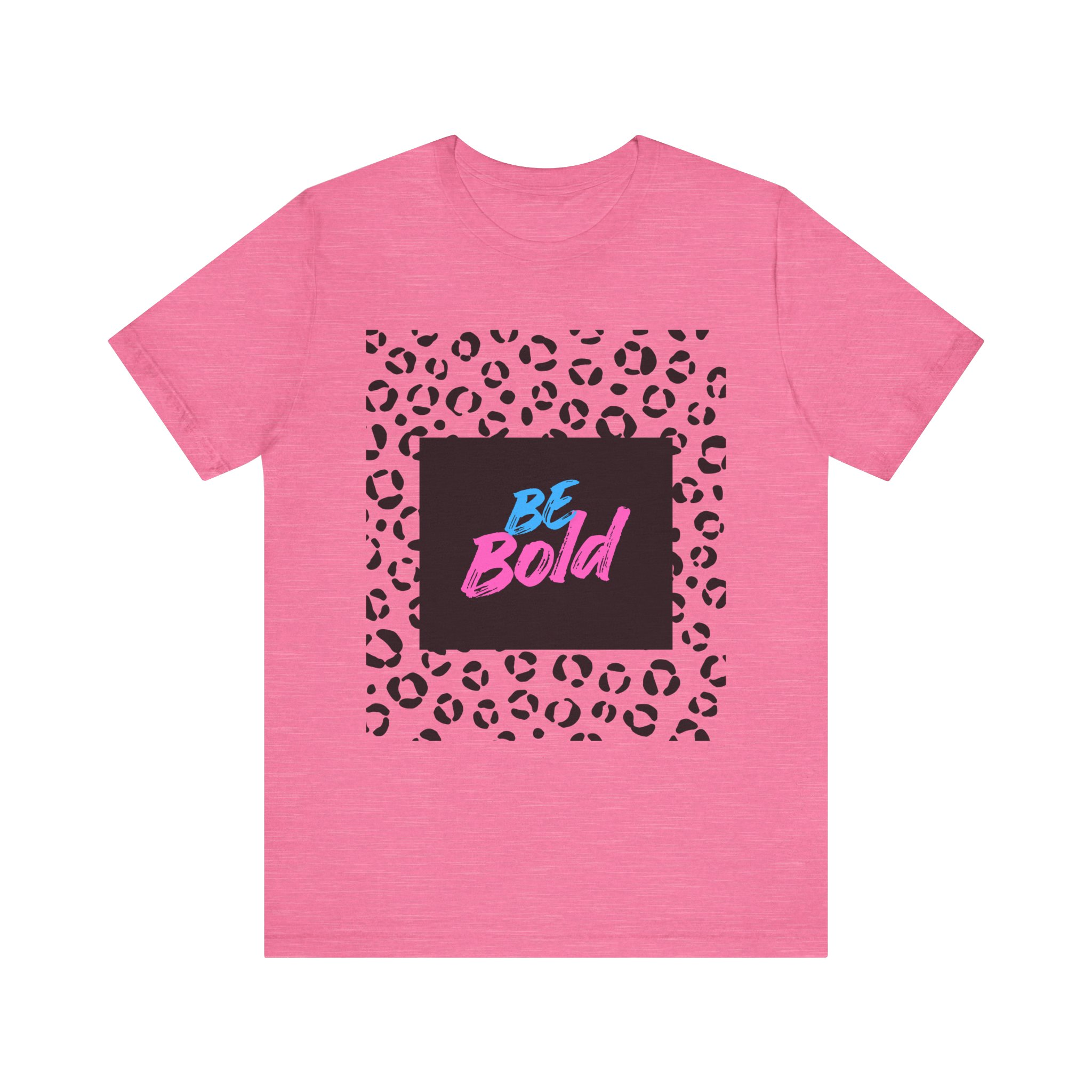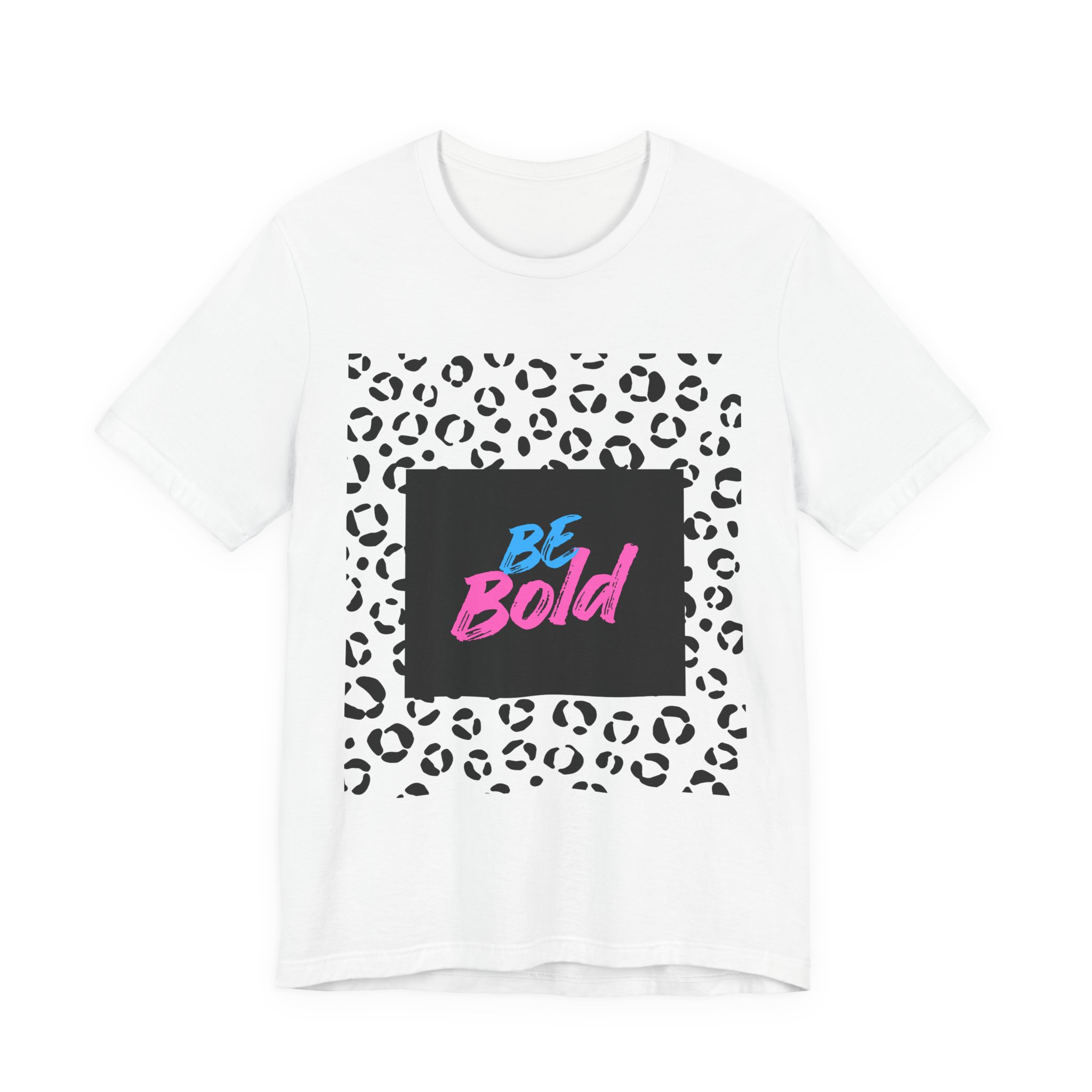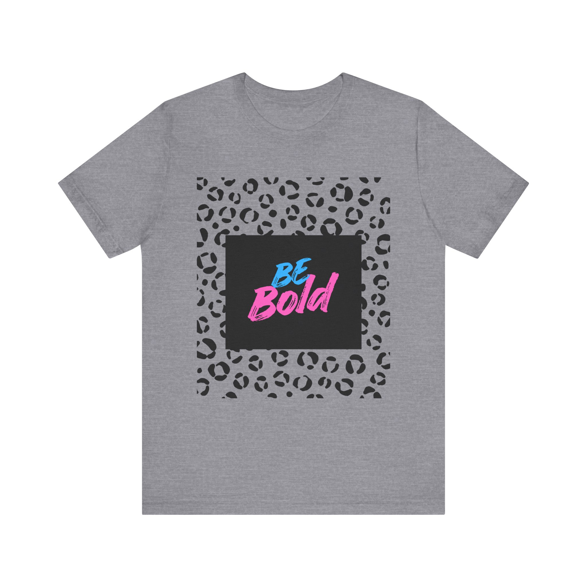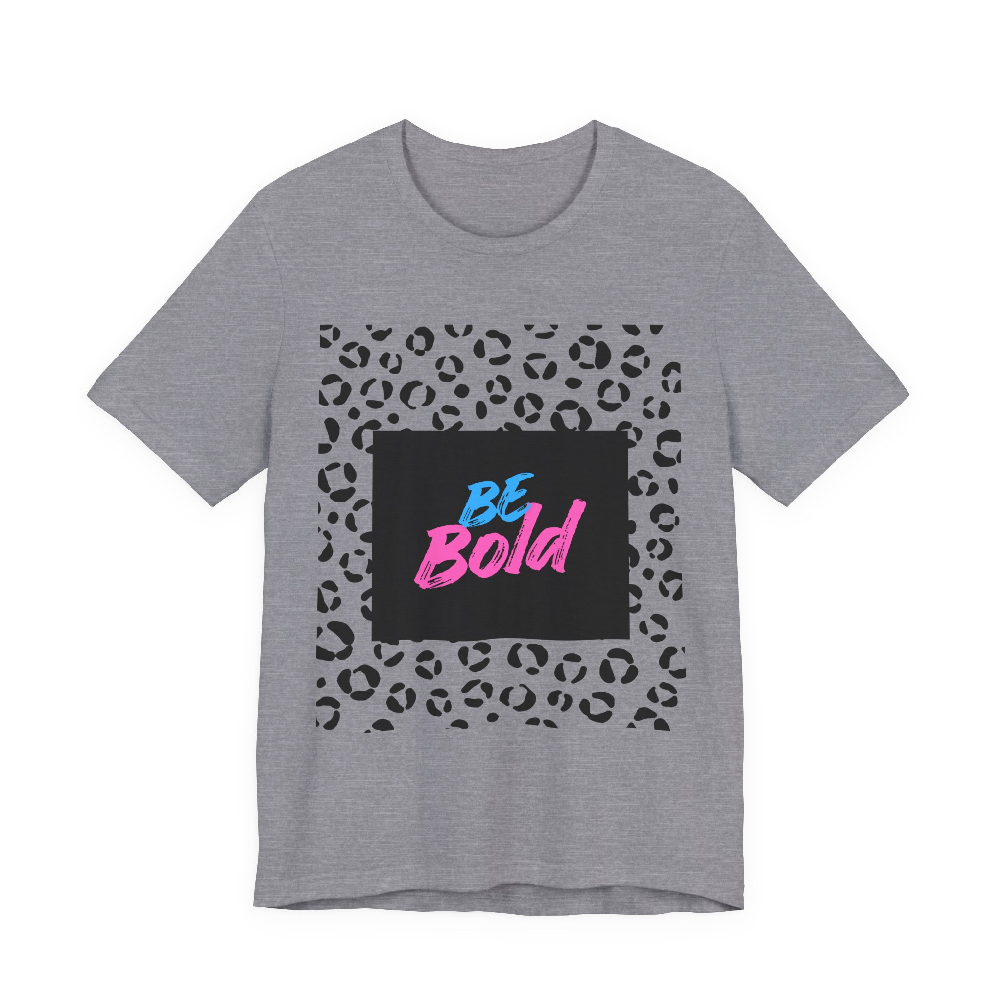 This lightweight jersey tee brings confident, playful energy to everyday wear. A bold neon “Be Bold” script sits against a deep square backdrop, framed by a modern black-and-white leopard print — a look that reads both edgy and fun. The breathable Airlume combed cotton feels soft on the skin and layers easily under jackets or over long sleeves. Wear it on busy city days, at casual meetups, or when you need a quick style lift that says you’re ready to stand out. The retail cut and crew neckline keep the silhouette neat and versatile, while the tear-away label and stable seams prioritize comfort for all-day wear.